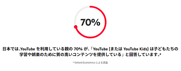 YouTube Kidsは、日本の子どもたちが安心してオンラインで学び、楽しむことができる環境を整備している。「保護者による使用制限機能」の提供も進んでおり、YouTubeを利用している保護者の70%が「YouTube(またはYouTube Kids)は、子どもたちの学習や娯楽のために質の高いコンテンツを提供している」と回答した。