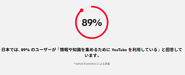 最後に、YouTubeは誰もがリアルタイムで情報や知識にアクセスできるプラットフォームとしても機能している。日本国内では、89%のユーザーが「情報や知識を集めるために YouTubeを利用している」と回答した。