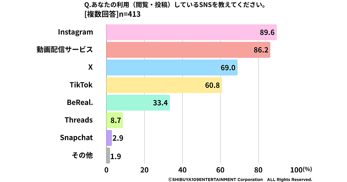 SHIBUYA109エンタテイメントが運営するSHIBUYA109 lab.は、「Z世代のSNS利用最新動向2025」に関する調査結果を発表した。15~24歳女性(高校生・大学生・大学院生・短大生・専門学生)413人が回答している。