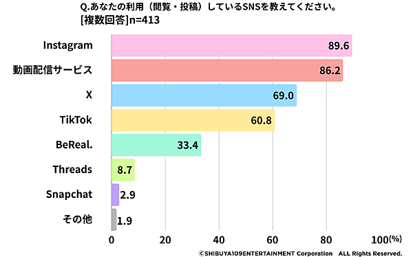 まず「利用(閲覧・投稿)しているSNS」を聞くと、「Instagram」89.6%が最多で、以下「動画配信サービス」86.2%、「X」69.0%、「TikTok」60.8%が続いた。