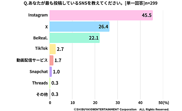 「もっとも投稿しているSNS」では、「Instagram」45.5%が最多で、「X」26.4%、「BeReal.」22.1%と順位が入れ替わる。なおInstagramの投稿のうちストーリーズは38.1%、フィード・リールは7.4%だった。