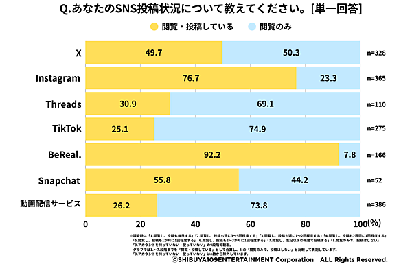さらに「SNSの投稿および閲覧の状況」を聞くと、「TikTok」や「動画配信サービス」は7割以上が「閲覧のみ」だったが、「BeReal.」は92.2%が投稿も行っていた。BeReal.は“投稿しないと他の人の投稿が閲覧できない” 仕組みとなっており、それが影響していると考えられる。他では、Instagram、X、Snapchatが投稿も活発だった。