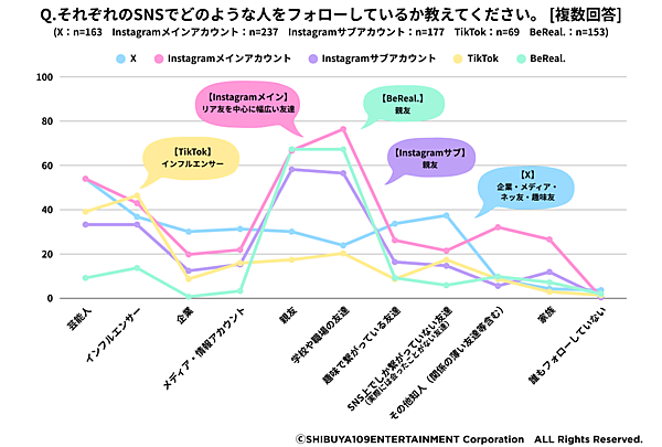 SHIBUYA109 lab.はこの結果に対し、Z世代にアクティブに使われているのは「ある程度絞られたクローズドで小さなコミュニティ」と繋がっているSNSであり、InstagramのストーリーズやBeReal.など「エフェメラル(24時間のみ表示など一時的に掲載される)」な使い方が主流であることが特徴だと考察している。
