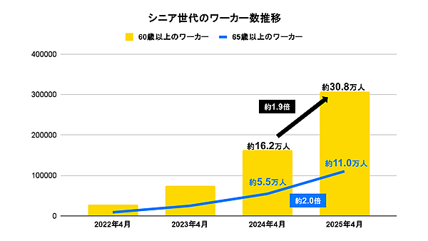 まず、タイミーに登録している60歳以上のシニア世代のワーカー数を見ると、2025年4月時点では約30.8万人にのぼり、前年同月比約1.9倍に増加した。65歳以上に絞ってみると約2.0倍に拡大しており、高齢層の就業意欲の高まりがうかがえた。なお、タイミーでの勤務実績がある最高齢の働き手は、2025年9月時点で「90歳」だった。