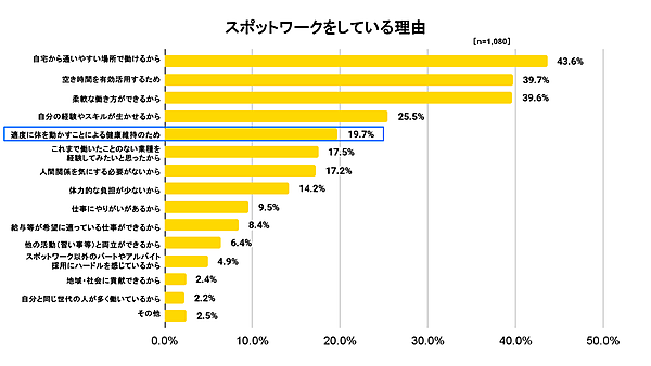スポットワークをしている理由としては、「自宅から通いやすい場所で働けるから(43.6%)」「空き時間を有効活用するため(39.7%)」「柔軟な働き方ができるから(39.6%)」が上位となった。