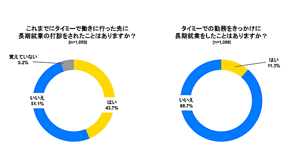 シニアワーカーに対し、勤務先から長期就業を打診されたことがあるかを聞くと、43.7%が「はい」と回答した。さらに、11.3%の働き手が、「実際に長期就業をした」と答えている。