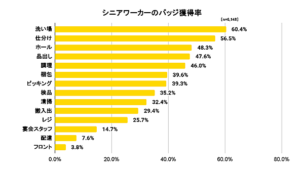 具体的にどのような職種で働いているかを聞くと、「軽作業(倉庫内作業)(61.3%)」が圧倒的に多く、ついで「飲食(35.9%)」となった。また、シニアワーカーがタイミーで獲得した「バッジ(働き手のスキルや実績が可視化されたもの)」の種類を見ると、「洗い場(60.4%)」「仕分け(56.5%)」が多かった。