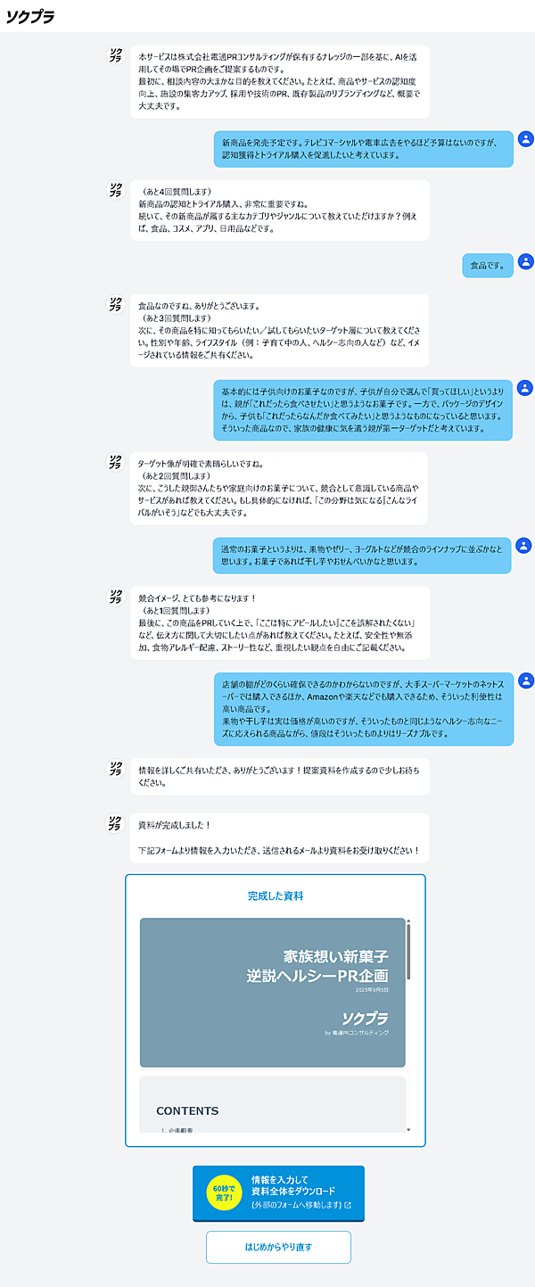 「ソクプラ」は、チャットで相談した内容をAIが企画書としてまとめてくれる無料のAI企画書作成ツールだ。24時間365日対応のAIチャットが、広報課題やPRニーズをヒアリングし、スライド形式の簡易な企画資料を自動作成する。