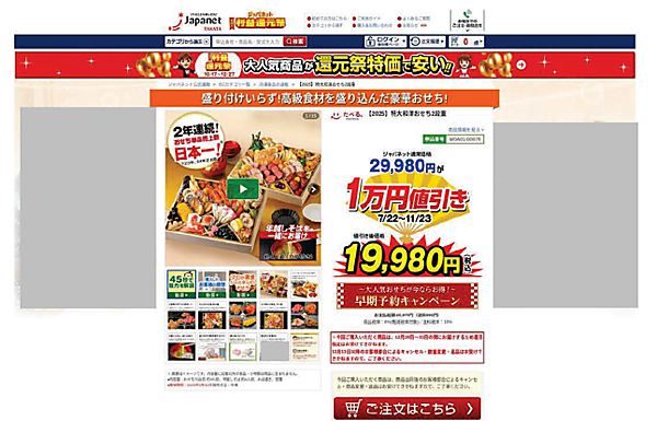 消費者庁によると、ジャパネットは自社サイト「ジャパネットたかた【公式】通販」で2024年10月8日~11月23日に「【2025】特大和洋おせち2段重」に関し、キャンペーン期間中は「通常価格」2万9800円が「1万円値引き」の1万9800円(税込み)になるなどと表示。キャンペーン終了後より安く買えるように思わせたものの、キャンペーン期間が終わると販売を終了した。