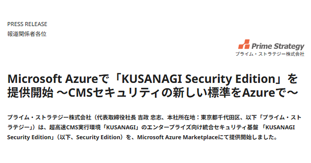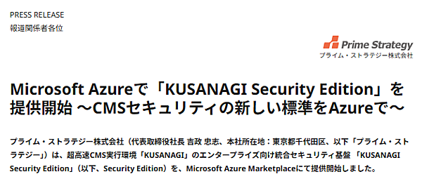 ウェブサイト・CMS(コンテンツ管理システム)高速化ソリューション事業のプライム・ストラテジーは、同社が展開する高速CMS実行環境「KUSANAGI」の企業向け統合セキュリティ基盤「KUSANAGI Security Edition」の提供を「Microsoft Azure Marketplace」で始めた、と9月11日発表した。さまざまなクラウド環境で利用を可能にした。