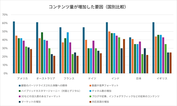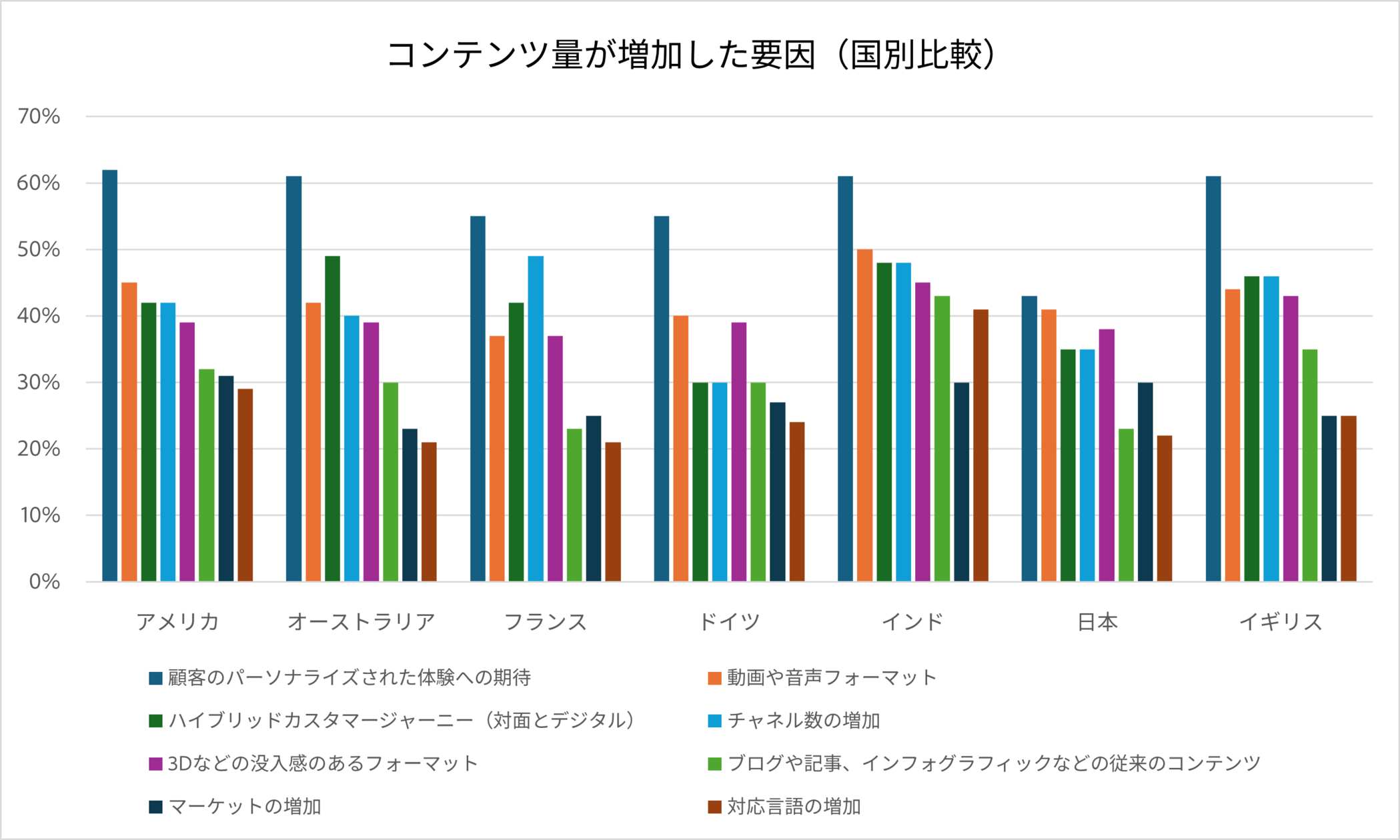 まず「コンテンツ増加の要因は何ですか」という質問に7か国のマーケターは、「パーソナライズされた体験に対する顧客の期待の高まり」だと指摘。すべての国でもっとも多い数値を示した(米国62%、インド・オーストラリア・英国61%、フランス・ドイツ55%、日本43%)。