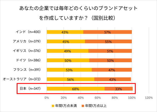 「年間を通してどれほどのブランドアセットを制作しているか」については各国で大きな差があり、インドは57%、米国は55%に達している。一方日本は33%にとどまり、調査対象国のなかでもっとも低かった。