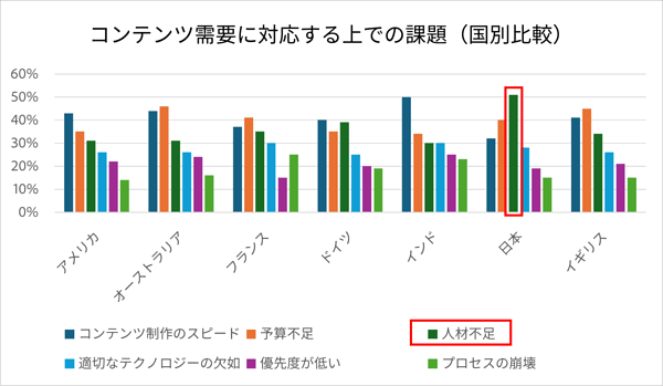 「コンテンツ需要に対する課題」として、多くの国では「コンテンツ制作のスピード」があがるが、日本は「人材不足」が最多で、他国とかなりの傾向差が見られた。さらに「テクノロジー」および「AI/AIコンテンツ作成ツール」への投資にも意欲を感じていた。一方で、「コンテンツの効果測定の改善」や「一元化されたコンテンツワークフローの構築」といった運用面への投資については、それぞれ24%、20%にとどまっている。