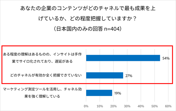 さらに27%の日本のマーケターは「どのチャンネルが有効かまったく把握できていない」と回答しており、「自社のコンテンツがどのチャンネルでもっとも成果を上げているか」について、十分に把握できていない現状も判明した。「ある程度の理解はあるものの、インサイトは手作業でサイロ化されており、遅延がある」と過半数が認識しており、大きな課題と言える。