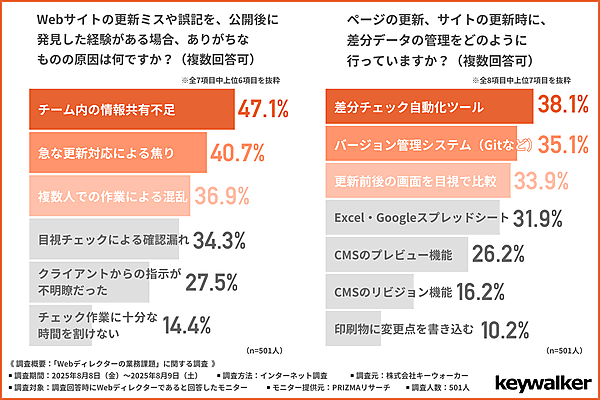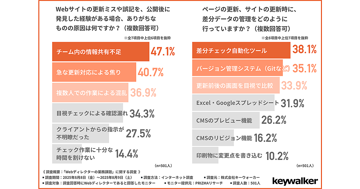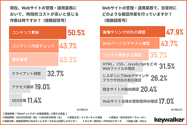 キーウォーカーは、「Webディレクターの業務課題」に関する調査を実施した。Webディレクター501人に対し、負担に感じる業務やサイト更新ミスの原因などを聞いている。