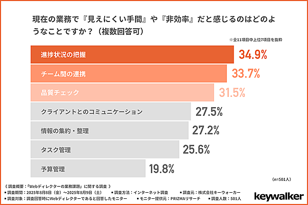 最後に、日々の業務でどんなことに対して「見えにくい手間」や「非効率」を感じているかを聞くと、「進捗状況の把握(34.9%)」「チーム間の連携(33.7%)」「品質チェック(31.5%)」が上位3つとなった。