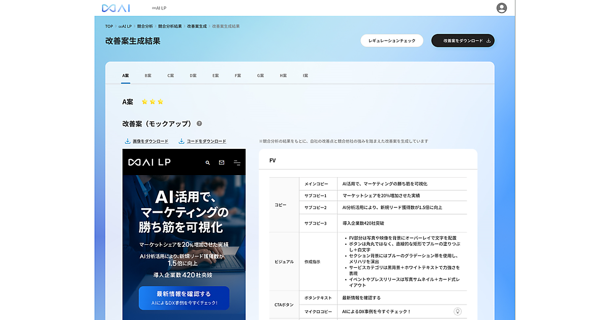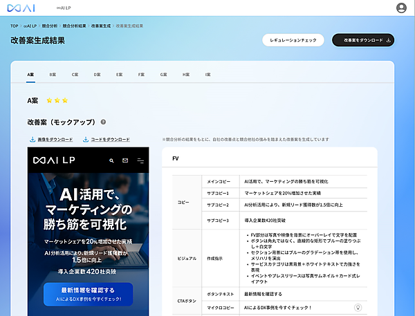 LP比較分析をもとに、競合他社の強みも踏まえた改善戦略を自動で設計する。FV(ファーストビュー)や商品・サービス説明、FAQなど主要コンテンツを含む最適なLP改善案を複数パターン同時生成する。テキストでの具体的な改善案の提示に加えて、デザイン・コードも生成してイメージを共有でき、LP制作工程を短縮する。LP内で使う画像も自動生成し、必ず担当者が仕上げをして肖像権や著作権リスクの回避やクオリティを担保する。