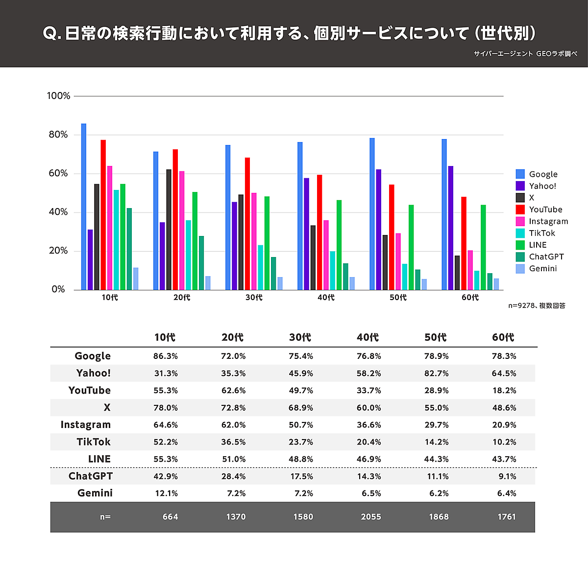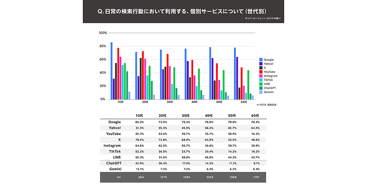検索行動を世代別に見ると、10代では「ChatGPT」の利用率が42.9%にのぼり、「Yahoo! JAPAN」の31.7%を10ポイント以上上回る結果に。また、20代では「YouTube」(72.8%)と「Google」(72.0%)がほぼ同等となっており、若年層における情報収集スタイルの変化がうかがえた。