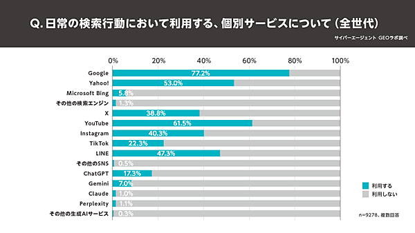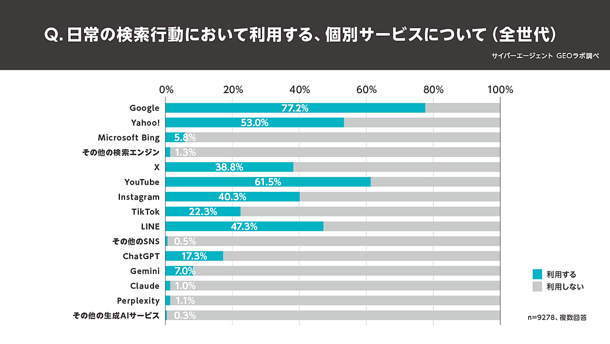検索行動で利用する個別のサービスとしては、「Google」が77.2%で圧倒的なトップに。「YouTube」(61.5%)や「Yahoo! JAPAN」(53.0%)も上位となった一方で、「ChatGPT」は17.3%にのぼり、一定の存在感を示した。