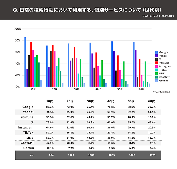 サイバーエージェントは、GEO研究を行う専門組織「GEO Lab.(GEOラボ) 」にて、「生成AIのユーザー利用実態に関する調査」を実施した。全国10代~60代の男女9,278名が回答している。