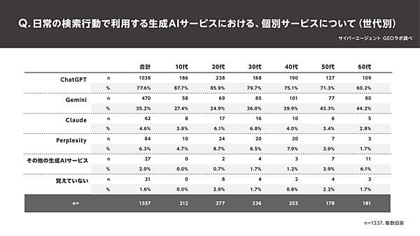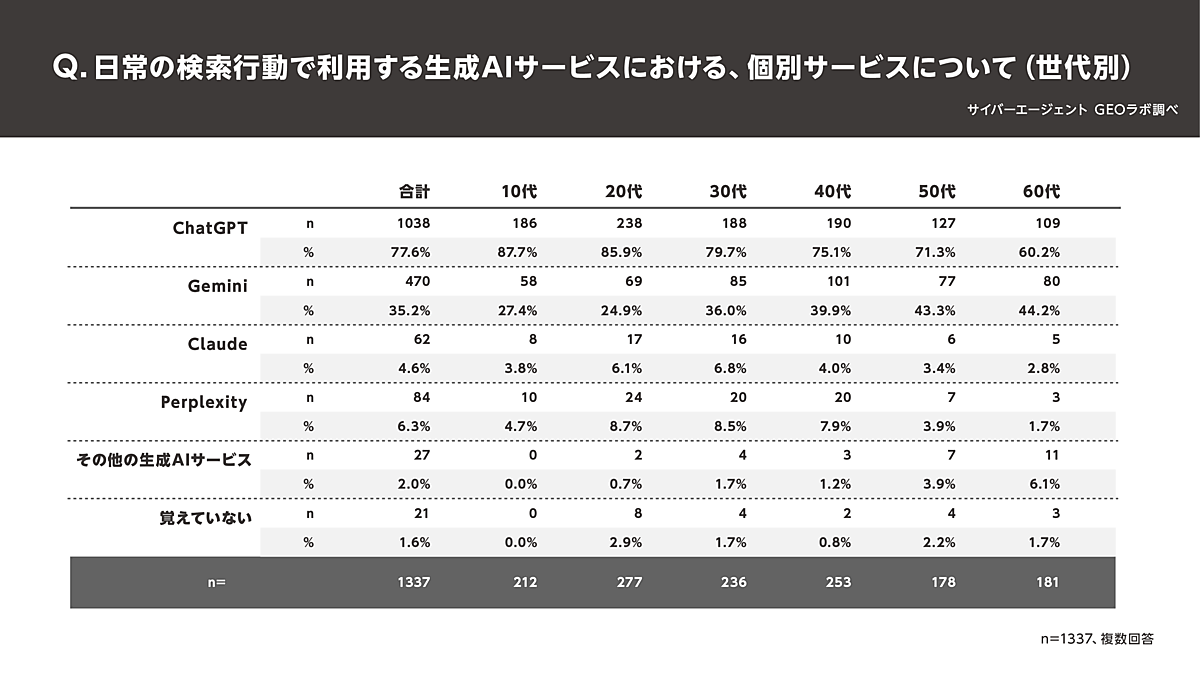 生成AIサービスの中で最も利用率が高かったのは「ChatGPT」で、全体の77.6%を占めた。特に10~20代での利用率は8割を超えており、若年層からの人気がうかがえた。一方で、50~60代では「Gemini」の利用率が4割を超えており、世代によって使用するサービスが異なることが明らかとなった。