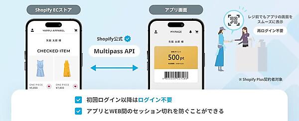 Shopifyが推奨する認証方式「Multipass API」に対応した。一度ログインすればアプリ内でECサイトを閲覧する際に再ログインが不要でログイン状態を保つ。ECサイトへのアクセスやレジ前での会員表示がスピーディになり、ストレスのない購買体験を実現する(Shopify Plusユーザー限定)。ECサイトに掲載した商品情報やブログ記事がアプリ上に自動的に最新情報としてネイティブ表示され、WEBに遷移せずに閲覧できるようになった。