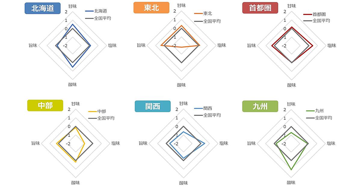 ここでは、60品の平均値を基準とし、各地域における風味の平均値をグラフ化して紹介する。