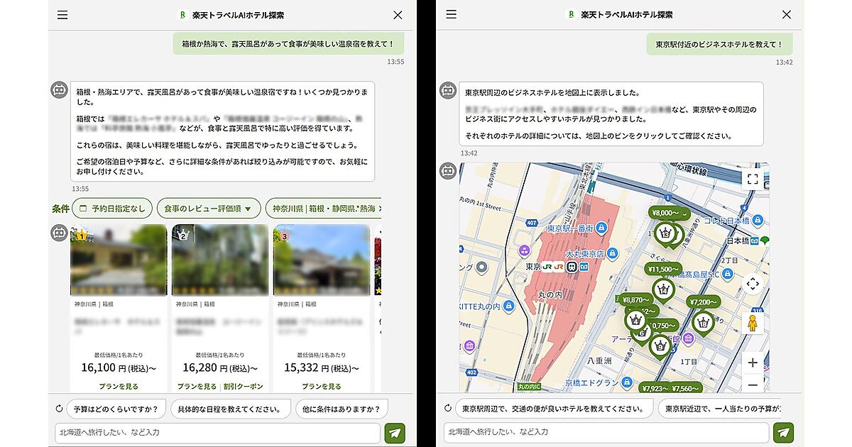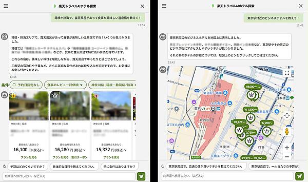 楽天トラベルのスマートフォン用ページから無料で利用できる。テキスト入力欄に宿泊場所、地域、期間、人数、構成、予算、宿タイプ、設備、サービスなどの条件を会話形式で入力すると、最適な宿泊施設をAIが最大30軒選ぶ。ユーザーは施設の写真、料金、クチコミ評価、個別条件に沿った「AIおすすめポイント」を含む概要や位置を比べられる。