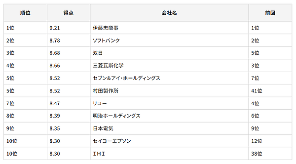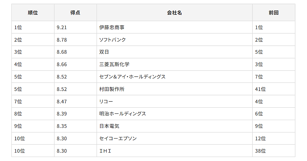 その結果「Gomez ESGサイトランキング2025」総合1位は、5年連続で「伊藤忠商事」だった。2位も前年に引き続き「ソフトバンク」だったが、3位は前年5位の「双日」がランクアップした。トップ10内では、前年41位→5位の「村田製作所」、前年38位→10位の「IHI」が目立つ。
