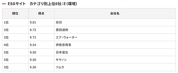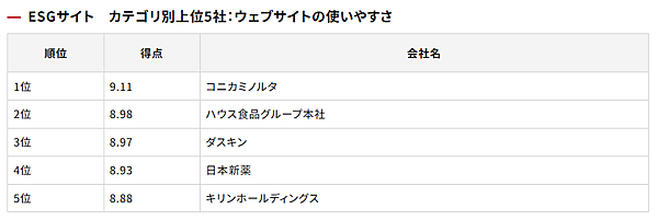 「ウェブサイトの使いやすさ」「ESG共通」「E(環境)」「S(社会)」「G(ガバナンス)」の5カテゴリごとの上位企業は以下のとおり。「ウェブサイトの使いやすさ」では「コニカミノルタ」、「S(社会)」では「日本電気」がトップになるなど、各社での強みの違いが見られた。