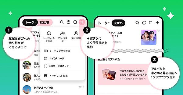 ①は、友だちリストなどが確認できる友だちタブを新たに設け、トークタブ画面最上部の[トーク]/[友だち]をタップして切り替えられるようにする。これまでのトーク画面や操作感のまま、友だちに関する機能を同じタブ内にして利便性を高める。+ボタンはトークタブ右上にあり「トークルームの作成」「グループの作成」「友だち追加」を集約する。