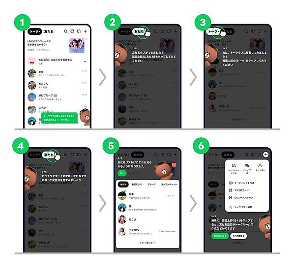 まとめて見るは、友だちやグループなど複数のトークルームで作成したアルバムが一覧で確認できる機能。リニューアルによって友だちタブから1タップでアクセス可能になる。新しいトークタブの操作方法の説明は、画面の右下に表示される吹き出しマークのタップで見られる。新トークタブはLINEバージョン15.16.0以上で年内にかけて順次提供する。