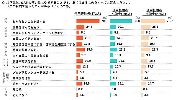 生成AIの使用目的を聞くと、「わからないことを調べる」が70.8%でトップに。従来の検索エンジンのような使い方が主流になりつつあることがうかがえた。小学生と中学生を比べると、中学生では「文章を作ってもらう」「文章のアイデアを出す」といった文章作成に関する利用がやや多かった。