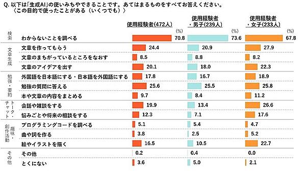 生成AIの使い方、「雑談・相談」は男子よりも女子が多め