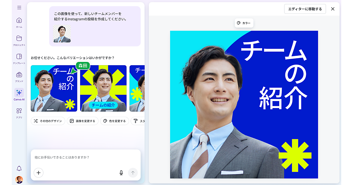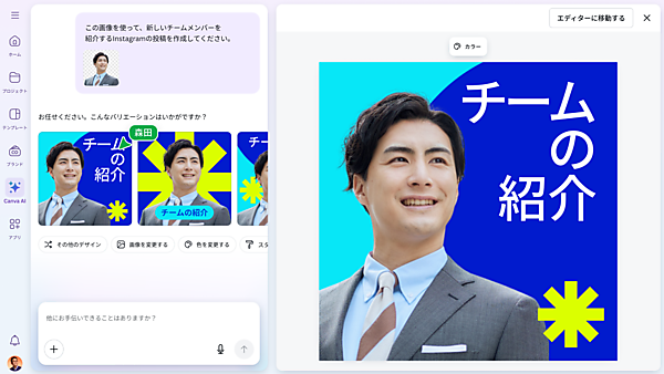 Canva AIは、専門知識がなくてもグラフィックデザインツール「Canva」ですぐにデザインが完成する。テキストや音声で作成したい内容を伝えるとキャンペーン企画や資料などがデザインできる。今回、日本語やフランス語、ドイツ語、イタリア語、スペイン語、ヒンディー語、中国語、韓国語、タイ語、ベトナム語などでも利用が可能になった。