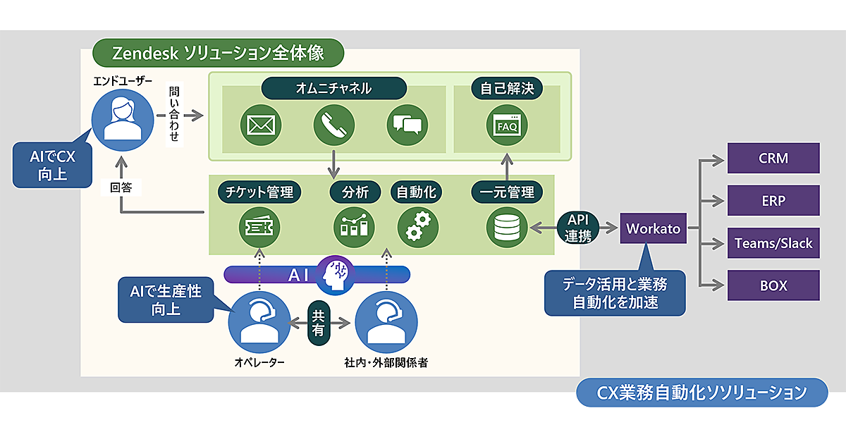 Zendeskはメール、チャット、SNS、電話など複数の顧客サポートチャネルからの問い合わせを一元管理でき、1つの画面で対応できる環境を提供する。顧客はコミュニケーションのチャネルを途中で変えても同じ情報を繰り返す必要がなく、ストレスのないスムーズな対応を受けられる。AIがFAQや他システムと連携して自動回答したり、より高度な問い合わせにはオペレータに回答内容を提案したりして、顧客対応の品質向上を実現する。