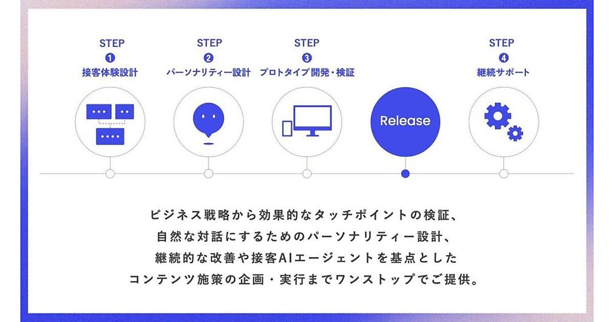 文章が冗長で判断がしづらい従来の対話型AIの課題を分析して、対話に沿って文章以外の図や写真を交えた最適な対話を設計する。役割や意図、言葉、距離感など人間のやりとりにある合図「ソーシャルキュー(社会的合図)」を用いた独自の「ソーシャルキューメソッド」で接客AIエージェントのパーソナリティーを綿密に設計する。戦略立案から運用までブランドにふさわしい顧客体験をアジャイル型で導入してスピーディーに実施する。