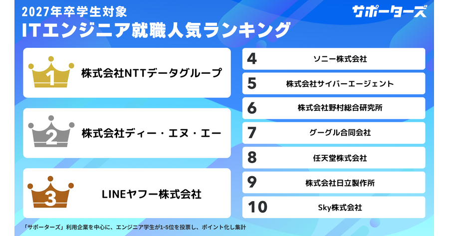 27卒ITエンジニア学生が選ぶ人気企業ランキング! NTTデータやLINEヤフーが上位に【サポーターズ調べ】 ITメガベンチャーや大手SIerが上位を独占。ハイクラス学生からはインターネット業界も人気。