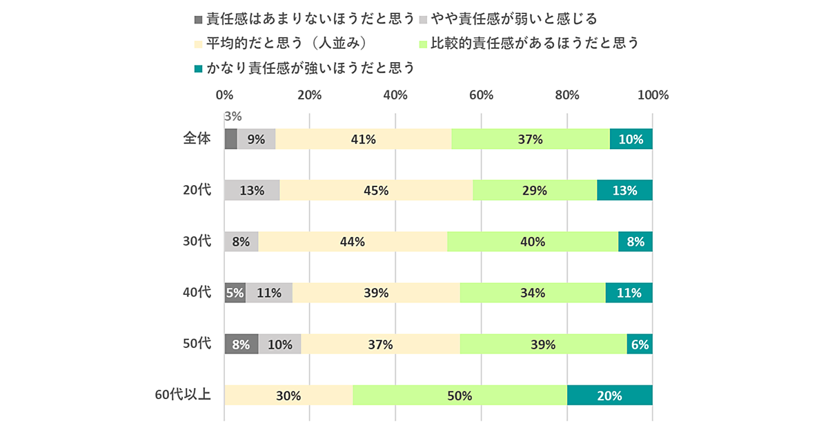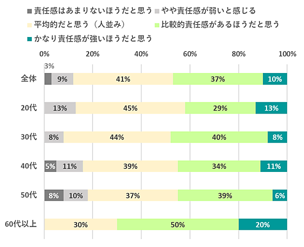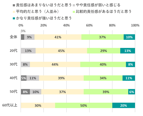 性年代別に見ると、60代以上では「かなり責任感が強いと思う」が20%、「責任感があるほうだと思う」が50%と突出して高く、年齢とともに自己評価が上昇する傾向が見られた。