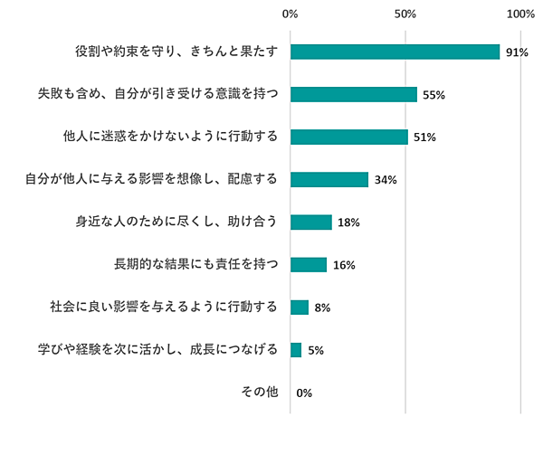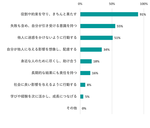 まず、「責任感」についてどのように認識しているかを聞くと、「役割や約束を守り、きちんと果たす」が91%で最多となった。2位以下は「失敗も含め自分が引き受ける意識を持つ」や「他人に迷惑をかけないように行動する」と続いている。