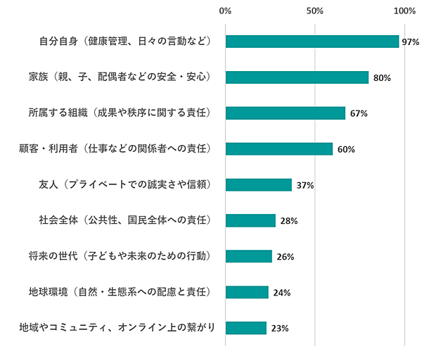 また、「自分の責任範囲」をどう捉えているかという質問では、「自分自身」が97%で最も多く、以下「家族」が80%、「所属する組織」が67%、「顧客・利用者」が60%と続いた。社会や地球環境といった広い範囲よりも、より身近な存在に対して強い責任感を抱く傾向がうかがえた。
