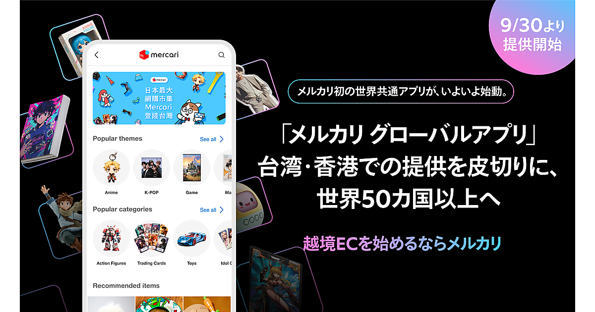 フリーマーケットアプリ「メルカリ」を展開するメルカリは、越境取引事業の新たな戦略を9月30日に発表した。同社初となる世界共通アプリ「メルカリ グローバルアプリ」の提供と、国内事業者向け越境EC基盤を強化する。越境取引での購入者・事業者双方の課題を解決してグローバルで事業拡大を目指す。アプリを台湾・香港で同日に開始し、2026年春には米国で提供。開始3年以内に50以上、中長期的に100以上の国や地域に展開する。