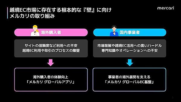 越境取引事業では世界的に人気の高い日本のエンタメ・ホビー領域に注力する。予約販売やオークション機能など取引を促す機能を導入し、コンテンツ権利元企業と連携して購入者・事業者双方に魅力的な取引体験を提供する。世界の越境EC市場が高い成長を続けていることから、海外の購入者と日本国内の事業者の双方の体験を向上させ、より簡単かつ安心・安全な取引環境構築を実現して日本発No1の越境マーケットプレイスを目指す。