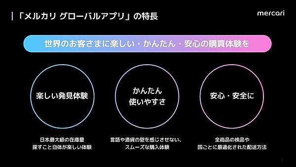 海外購入者はグローバルアプリで日本の「メルカリ」と「メルカリShops」の商品を閲覧・購入できる。AI(人工知能)によるリアルタイム翻訳と各国・地域の通貨・決済方法に対応してストレスのない購入体験を実現する。26年1月以降は発送前にメルカリが全商品をチェックして品質を保証する「全品検品」を導入。決済から配送状況追跡までアプリ上で完結して「本当に届くのか」「品質に問題はないか」の越境取引の不安を解消する。