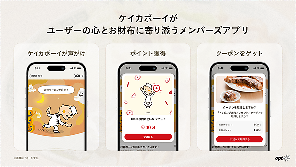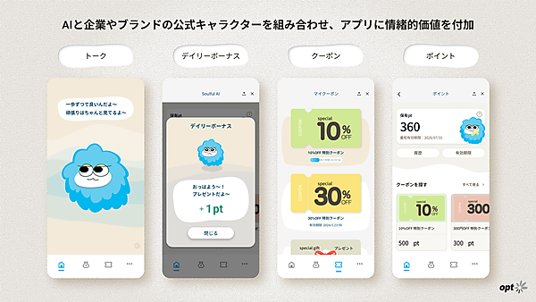 AIによるキャラクターのトーク機能によって、LINEミニアプリ起動時にAIがキャラクターの個性を反映したメッセージを自動生成して表示。デイリーボーナス機能でLINEミニアプリ起動時にポイントを付与する。ポイントの付与・蓄積、インセンティブとの交換を一元管理するメンバーズポイント管理機能や、特典や割引情報を配布し、利用を促進するクーポン機能もある。オプトは公式キャラクターの企画からデザイン、制作も支援する。