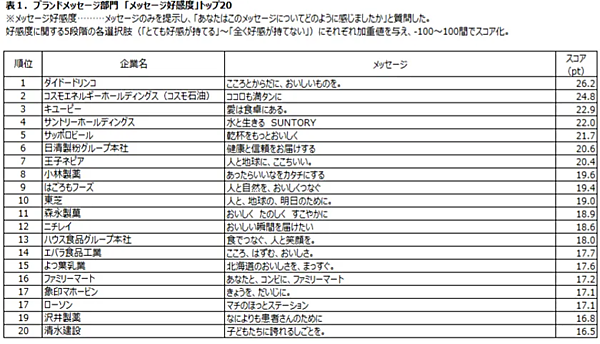 まず、ブランドメッセージに対する好感度ランキングでは、ダイドードリンコの「こころとからだに、おいしいものを。」が2年連続1位を獲得。2位は昨年に引き続きコスモエネルギーホールディングスの「ココロも満タンに」、3位は前回から16ランク上昇したキユーピーの「愛は食卓にある。」となった。