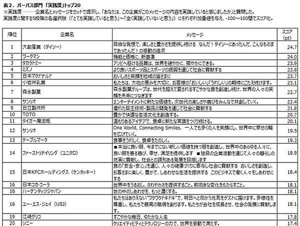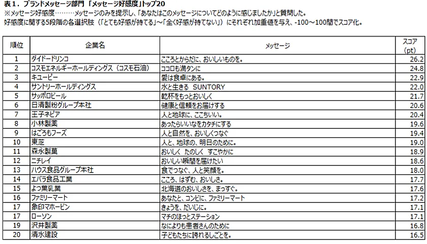 企業メッセージ好感度、1位は「こころとからだに、おいしいものを。」