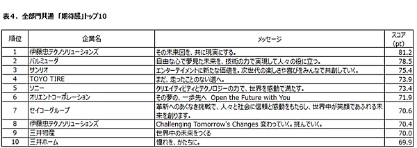 「期待感」では、伊藤忠テクノソリューションズのブランドメッセージ「その未来図を、共に現実にする。」がトップに。2位はバルミューダの「自由な心で夢見た未来を、技術の力で実現して人々の役に立つ。」だった。