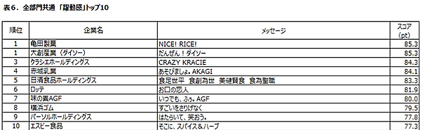 なお、この4つの指標の合計得点が最も高かったのはロッテのブランドメッセージ「お口の恋人」。2位はサントリーホールディングスの「水と生きる SUNTORY」、3位は日本航空(JAL)の「明日の空へ、日本の翼」と続いた。