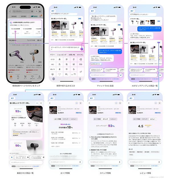 例えば「強めの風量のドライヤー」のような条件で絞り込み、「髪に優しいドライヤーは?」「静かに使えるほうが嬉しい」などの質問や要望にも対応する。「3人用の炊飯器」は自動的に「3合炊き」と適切な「絞り込み条件」にして、「観音開きとは」など絞り込み条件の意味や違いをAIが説明する。条件選びに迷った際は適切なフィルター候補を提案して条件に基づく商品リストを提示。検索対象を拡大して多様な選択肢も表示できる。